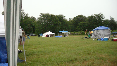 It was at this point in the day that things got a little bit dicey. The weather, which had blissfully cooled during the last hour, now started shifting winds. The partly-cloudy and sunny day we'd started with had turned dark and overcast. Then the lightning started dancing all around us. The winds whipped up, and tents went a-flyin'. We grabbed ours and held on for dear life for about 30 minutes, as we watched some folks head for their cars, some for the tree line, and others, apparently as dumb as we were, hunker down to wait out Mother Nature's wrath. But wait it out we did, and after a little clean-up and de-tarping, the stage was back ready for entertainers.